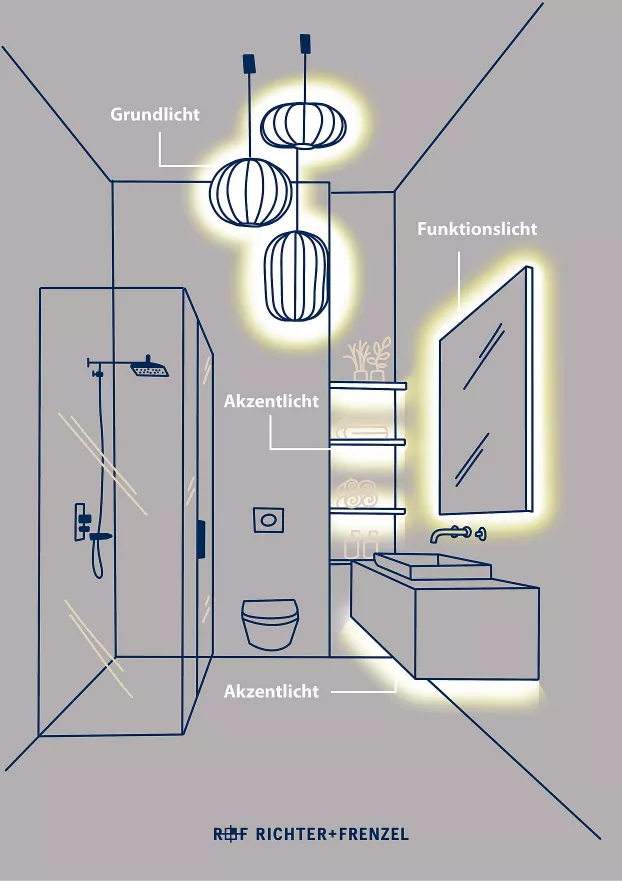 Das Grundlicht bildet die gleichmäßige, flächige Beleuchtung des Raumes und schafft eine angenehme Grundhelligkeit. Es sorgt dafür, dass sich das Badezimmer auch ohne Fenster hell und einladend anfühlt.